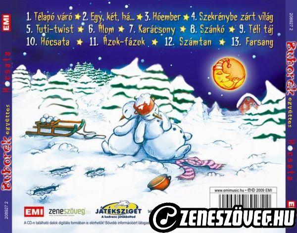 Buborék együttes: Hócsata 1. Kesztyűt húzunk a kezünkre, Sapkát teszünk a fejünkre. Hosszú sálat a nyakunkba, Indul a nagy csata! 2. Vedd fel gyorsan a kabátod, Hívd el az összes barátod! tovább a dalszöveghez 9063